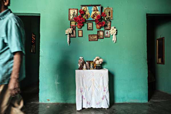 SALA DO SANTO aborda nas imagens, em cores concentradas, as paredes votivas presentes nas salas das casas da Ladeira do Horto, rua que dá acesso à célebre estátua do Padre Cícero, no cume da colina em Juazeiro do Norte. A pedido do “Santo do Sertão”, os devotos “doam” seus lares ao “Sagrado”. À sua volta, o devoto coloca imagens dos santos preferidos e de entes queridos, vivos ou mortos, recriando no imaginário popular uma ‘corte’ celestial particular, que reflete a devoção dos fiéis.