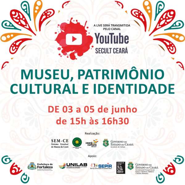 Buscando apresentar experiências educativas e perspectivas sobre os museus e/ou processos museológicos em relação às culturas negras, indígenas e ciganas e as suas relações com o patrimônio cultural cearense, em especial ao patrimônio museológico e as ações preservacionistas em relação à história e à cultura relacionada a essas populações, a Secult, o Sistema Estadual de Museus e parceiros realizam nos dias 03, 04 e 05 de junho o evento Museu, Patrimônio Cultural e Identidade, através do YouTube da Secult.