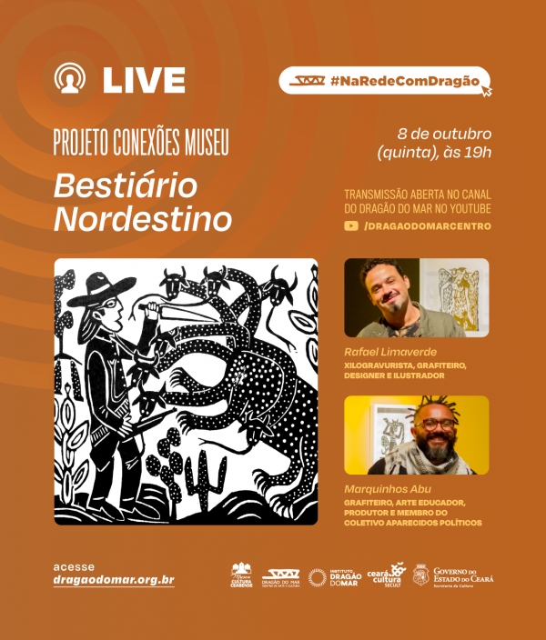 Dando continuidade à programação do Conexões Museus, programa do Museu da Cultura Cearense (MCC) que desde 2019 provoca reflexões e práticas que contextualizam e ressignificam o campo museológico contemporâneo, o Centro Dragão do Mar de Arte e Cultura, equipamento da Secretaria da Cultura do Estado do Ceará (Secult) realiza, nesta quinta-feira (8), uma conversa ao vivo com os curadores do “Bestiário Nordestino”, projeto que reúne produções artísticas em torno do mundo fantástico no imaginário nordestino. Na live homônima, Rafael Limaverde e Marquinhos Abu discutem as experiências dos projetos Bestiário Nordestino e Bestiário na Estrada, a partir das 19h, no canal do Dragão do Mar no YouTube (www.youtube.com/dragaodomarcentro). O bate-papo será mediado pelo coordenador do Núcleo Educativo do MCC, Ícaro Souza.