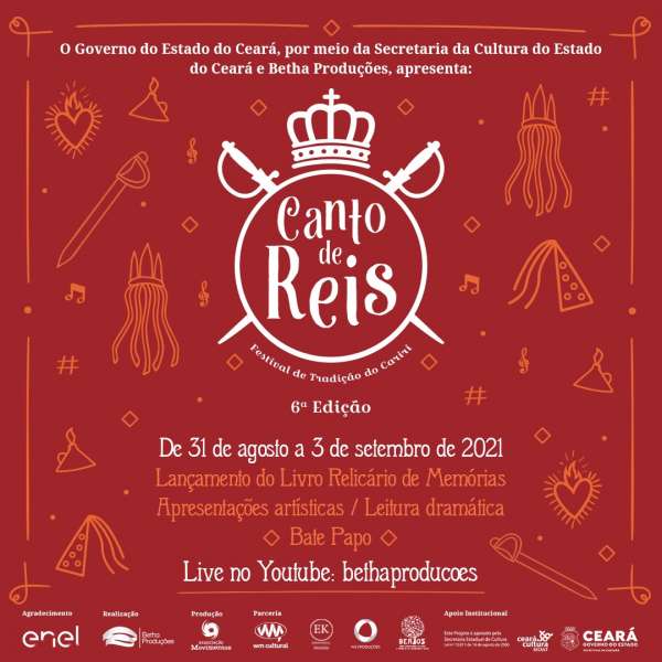 O Governo do Estado do Ceará, por meio da Secretaria da Cultura do Ceará (Secult Ceará) e a Betha Produções realizam até a próxima sexta-feira (03/09) a 6ª edição do Cantos de Reis – Festival de Tradição do Cariri. Esta edição vem enfocando em suas mesas temáticas, a oralidade, a escrita e a ancestralidade presentes no livro Relicário de Memórias, que será lançado nesta sexta-feira (03/09) através de uma live especial reunindo a equipe de organizadores da publicação.