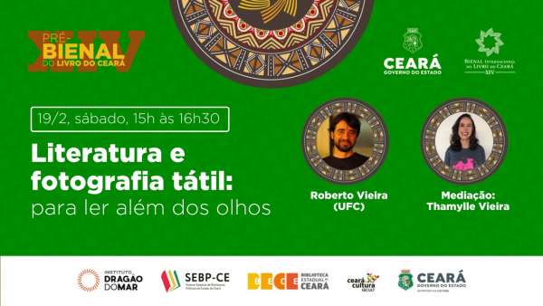 Também no sábado (19), das 15h às 16h, a programação da Pré-Bienal do Livro trará o tema: Literatura e fotografia tátil: para ler além dos olhos, com Roberto Vieira (UFC) e mediação de Thamylle Vieira, transmitido no Youtube da Biblioteca Pública Estadual do Ceará (BECE).