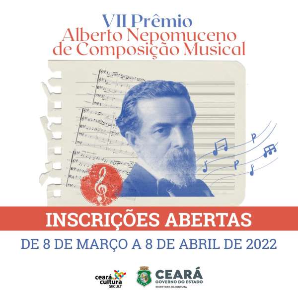 A Secretaria da Cultura do Estado do Ceará (Secult Ceará) abre, nesta terça-feira (8), as inscrições para o VII Prêmio Alberto Nepomuceno de Composição Musical, que tem por objetivo a concessão de prêmio para reconhecimento a composições e arranjos musicais inéditos criados para solistas, orquestras, bandas de músicas e grupos instrumentais com formações flexíveis. Serão premiadas 30 composições originais nas categorias de Orquestra Sinfônica, Orquestra de Cordas, Banda de Música e Grupo Instrumental com Formação Flexível, e 11 arranjos de obras do compositor e regente cearense Alberto Nepomuceno nas mesmas categorias. Com recursos do Fundo Estadual de Cultura, o investimento é de R$ 174 mil. As inscrições são online, gratuitas e seguem abertas até 8 de abril de 2022. Mais informações estão disponíveis no site de editais da Secult Ceará: http://editais.cultura.ce.gov.br/.