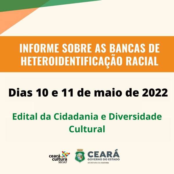 A Secretaria da Cultura do Estado do Ceará (Secult Ceará) informa a realização, em parceria com a Universidade Estadual do Ceará (UECE), nos dias 10 e 11 de maio, de forma remota, das Bancas de Heteroidentificação Racial referentes ao Edital da Cidadania e Diversidade Cultural, em cumprimento às diretrizes do Plano Estadual de Cultura, e dando continuidade ao avanço na implementação de políticas mais sólidas direcionadas a uma agenda afirmativa.