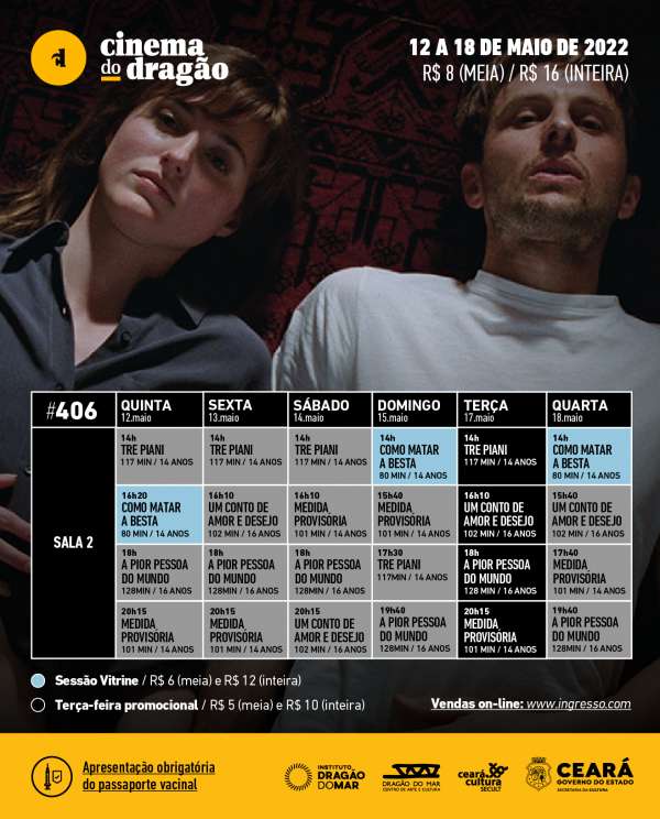 A grade inclui ainda quatro títulos. ‘Um Conto de Amor e Desejo’ (Leyla Bouzid), melhor filme no Festival Du Film Francophone D’Angoulême 2021; a distopia realista brasileira ‘Medida Provisória’ (Lázaro Ramos); e o drama familiar do diretor Nanni Moretti, ‘Tre Piani’ compõem a grade regular, com ingressos a R$ 8 (meia) e R$ 16 (inteira). Também integra a programação ‘Como Matar a Besta’ (Agustina San Martín), estreia da Sessão Vitrine 2022, com valores reduzidos de R$ 6,00 (meia) e R$12,00 (inteira). A compra dos bilhetes pode ser efetuada na bilheteria física do Cinema e no site Ingresso.Com (www.ingresso.com/cinema/cinema-do-dragao).