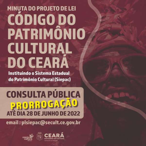 A Secretaria da Cultura do Estado do Ceará (Secult Ceará) prorroga, até o dia 28 de junho, o prazo de consulta pública da minuta do Projeto de Lei do Código do Patrimônio Cultural do Ceará. Com a ampliação da data, interessados terão mais dias para fazer sugestões e comentários sobre a minuta do projeto de lei que institui o Sistema Estadual do Patrimônio Cultural (Siepac). A consulta pública está disponível no site de Editais da Secult Ceará: https://editais.cultura.ce.gov.br/. A Secult Ceará convida toda a sociedade a participar deste momento singular de renovação e aprimoramento das políticas públicas de cultura do Estado do Ceará.