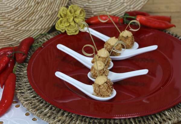 Croc de Moça (massa frita adocicada e saborizada com bacon empanado com panko e coco ralado e servida com ganache de pimenta)