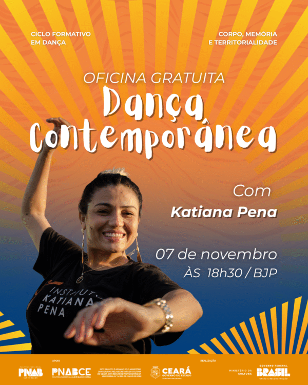 A atividade propõe um trabalho voltado para o desbloqueio corporal e a liberdade de movimento, explorando a coordenação motora, a expressividade e a conexão com o próprio corpo. A proposta busca incentivar o autoconhecimento em cena e a presença no aqui e agora, por meio de exercícios dinâmicos e criativos. Natural de Fortaleza, Katiana Pena é fundadora do Instituto Katiana Pena e uma das principais referências da dança no Grande Bom Jardim. Formada pelo Curso Técnico em Dança do SENAC e pela EDISCA, a artista acumula prêmios como Melhor Coreógrafa de 2016 (SATED-CE), Prêmio Veja-se 2018 (Revista Veja) e a Medalha Iracema de Fortaleza (2024), maior comenda concedida pelo Poder Executivo Municipal.
