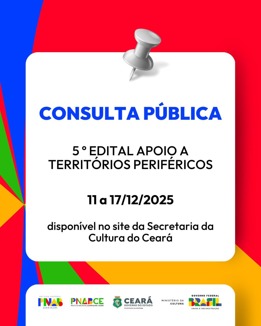 A Secult Ceará segue avançando na execução do segundo ciclo da Política Nacional Aldir Blanc (PNAB) e disponibiliza, a partir desta quinta-feira, 11 de novembro, a consulta pública do 5º Edital Territórios Periféricos. O texto está aberto para contribuições até 17 de dezembro na aba Editais do site da Secretaria da Cultura do Ceará. Integrando o segundo bloco de editais deste ciclo, o lançamento reforça o compromisso de ampliar a participação social e fortalecer o processo de construção coletiva das políticas culturais no estado.