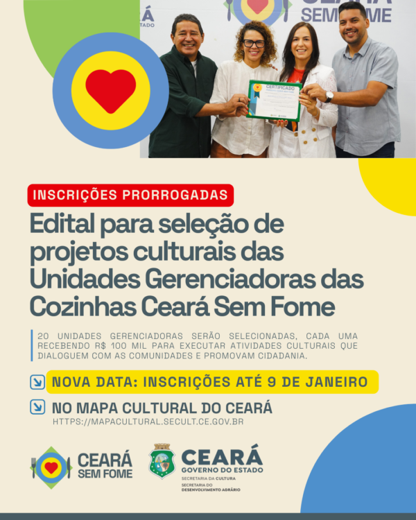O Governo do Ceará prorrogou, até o dia 9 de janeiro, o prazo de inscrição para o edital que seleciona projetos culturais a serem desenvolvidos nas Cozinhas do Programa Ceará Sem Fome. A iniciativa é realizada por meio do Programa Ceará Sem Fome, em parceria com a Secretaria da Cultura do Ceará (Secult) e a Secretaria do Desenvolvimento Agrário (SDA).