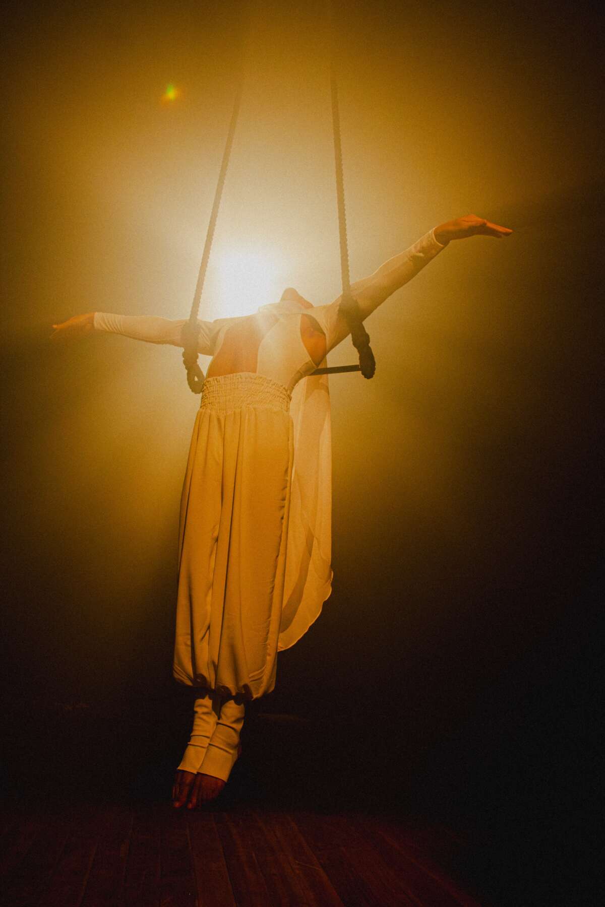 Preces, é um feitiço demasiado em sussurro. Levitar é verbo e reza. Suspensão. Um corpo poroso atravessa o invisível. No balanço do ar. Vibração sonora. Entre o chão e o céu a carne escuta o “divino”.