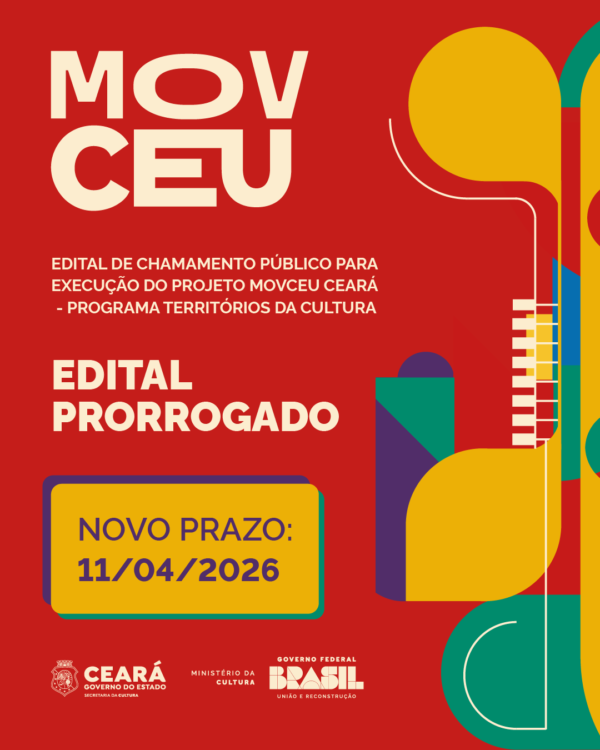 Estão prorrogadas as inscrições para o Edital de Chamamento Público para Execução do Projeto MovCEU Ceará, iniciativa da Secretaria da Cultura do Ceará (Secult Ceará) no âmbito do Programa Territórios da Cultura. As organizações interessadas devem se inscrever de 12 de março a 11 de abril de 2026, até às 23h59, por meio exclusivo da plataforma Mapa Cultural do Ceará.