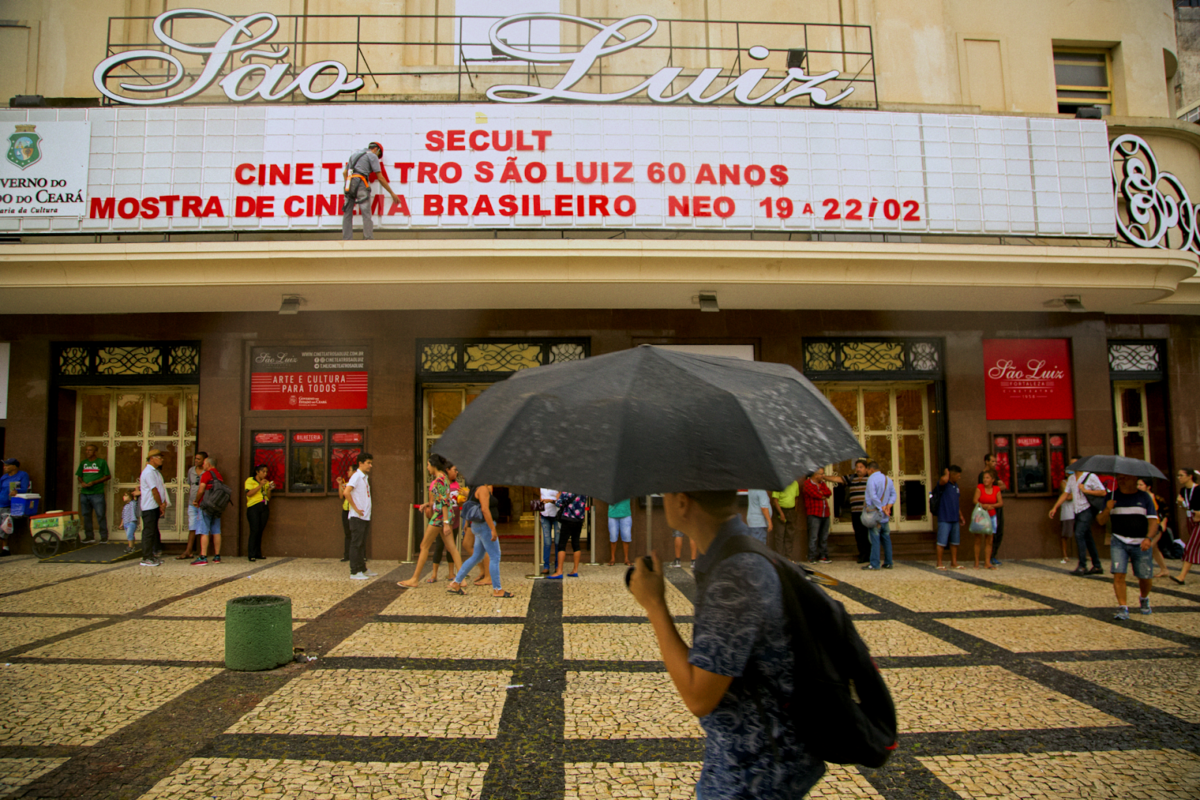 Uma das imagens da exposição mostra o letreiro do Cineteatro São Luiz, marco arquitetônico e cultural localizado no Centro de Fortaleza. Fundado em março de 1958 pelo empresário cearense Luiz Severiano Ribeiro, o local foi tombado como patrimônio histórico e cultural estadual em 1991.