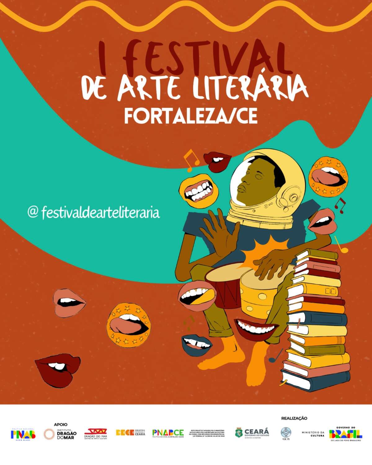 Nos dias 7, 8 e 9 de maio ocorrerá o I Festival de Arte Literária. O evento se dividirá entre os equipamentos culturais Centro Dragão do Mar de Arte e Cultura e a Biblioteca Pública Estadual do Ceará (Bece) — espaços que integram a Rede Pública de Equipamentos Culturais (Rece) do Governo do Ceará, vinculada à Secretaria da Cultura (Secult) e geridos em parceria com o Instituto Dragão do Mar (IDM). A programação conta com nomes do cenário local e nacional, como Lucas Barros (@lucasbarrosd), Nina Rizzi (@ninaarizzi), Renata Froan, Jorge Nogueira, Caio Balaio e Seu Rosinha (Oziel Herbert).